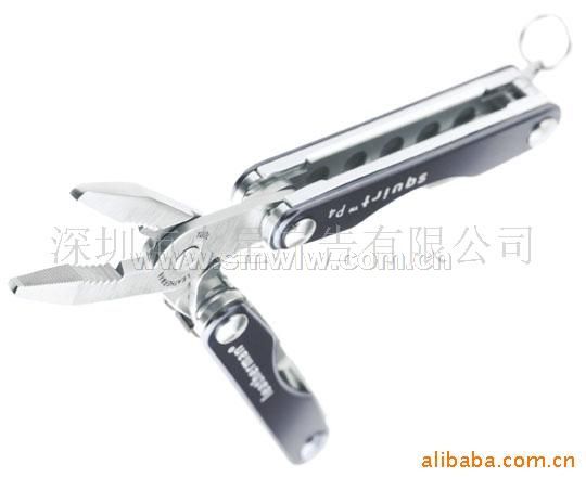 功能配件:尖嘴钳、直刃刀、剪线钳、袖珍螺丝刀、中号螺丝刀、平头十字螺丝刀、木/金属锉、开瓶器、钥匙环附件、锥子